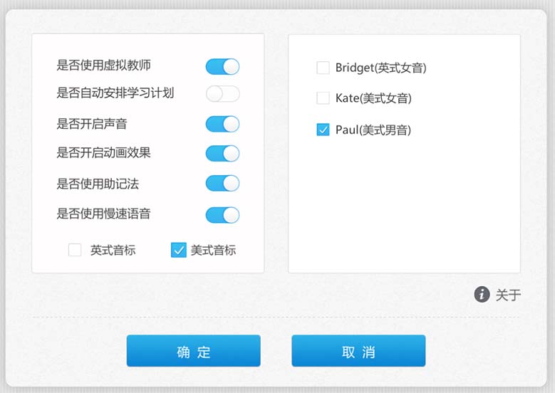 1) 选择语音。我们包含有英式女音,美式女音,美式男音三种语音,每一种语音又包含常速和慢速两种。