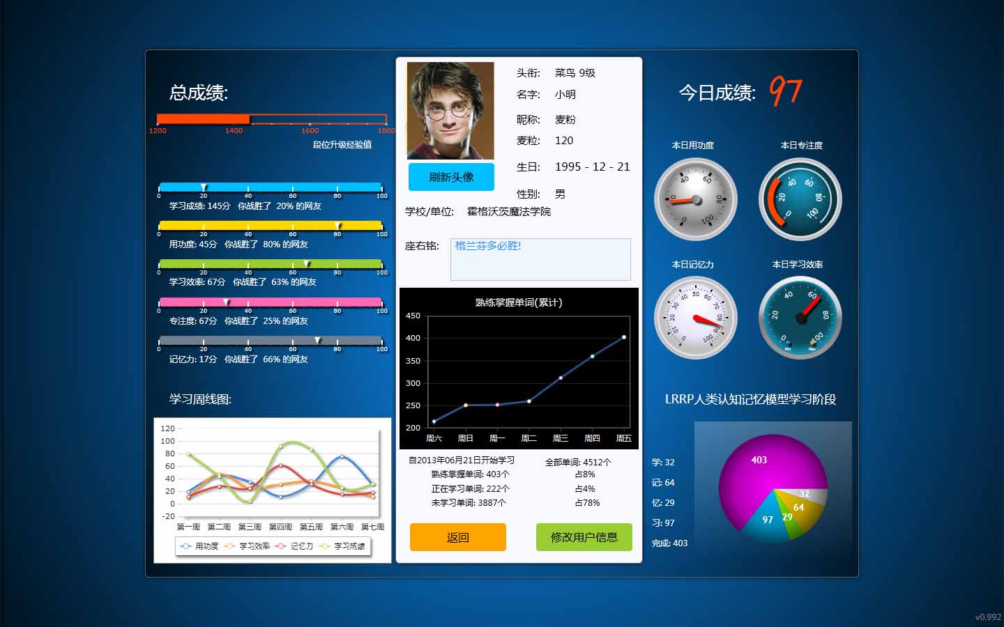 在线学习成绩单与排行榜即时反映你当天的和历史的学习成绩、学习效率、记忆力、注意力、用功程度的变化,段位等级等信息,并以图表的形式提供了本人当天各项成绩与本人历史成绩、与网友平均成绩之间的比较,以便于你精确掌握自己的学习情况和成长路径。