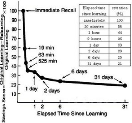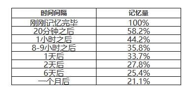德国心理学家艾宾浩斯(H.Ebbinghaus)研究发现,遗忘在学习之后立即开始,而且遗忘的进程并不是均匀的。初遗忘速度很快,以后逐渐缓慢。他认为"保持和遗忘是时间的函数",他用无意义音节(由若干音节字母组成、能够读出、但无内容意义即不是词的音节)作记忆材料,用节省法计算保持和遗忘的数量。并根据他的实验结果绘成描述遗忘进程的曲线,即著名的艾宾浩斯记忆遗忘曲线。